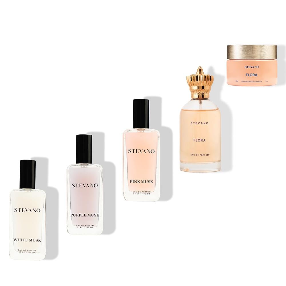تتكون المجموعة من عطر فلورا 100مل + بودرة فلورا 200جم + مجموعة عطور مسك 3*1 50مل لكل عبوة